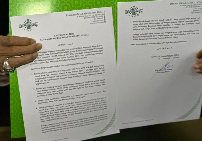 “Terhitung mulai tanggal 26 November 2025 pukul 00.45 WIB, KH Yahya Cholil Staquf tidak lagi berstatus sebagai Ketua Umum PBNU. Sejak saat itu, kepemimpinan PBNU sepenuhnya berada di tangan Rais Aam,” kata Kiai Miftah usai silaturahmi Rais Aam PBNU dengan para Syuriah PBNU dan 36 PWNU yang digelar di kantor PWNU Jawa Timur, Sabtu (29/11/2025).