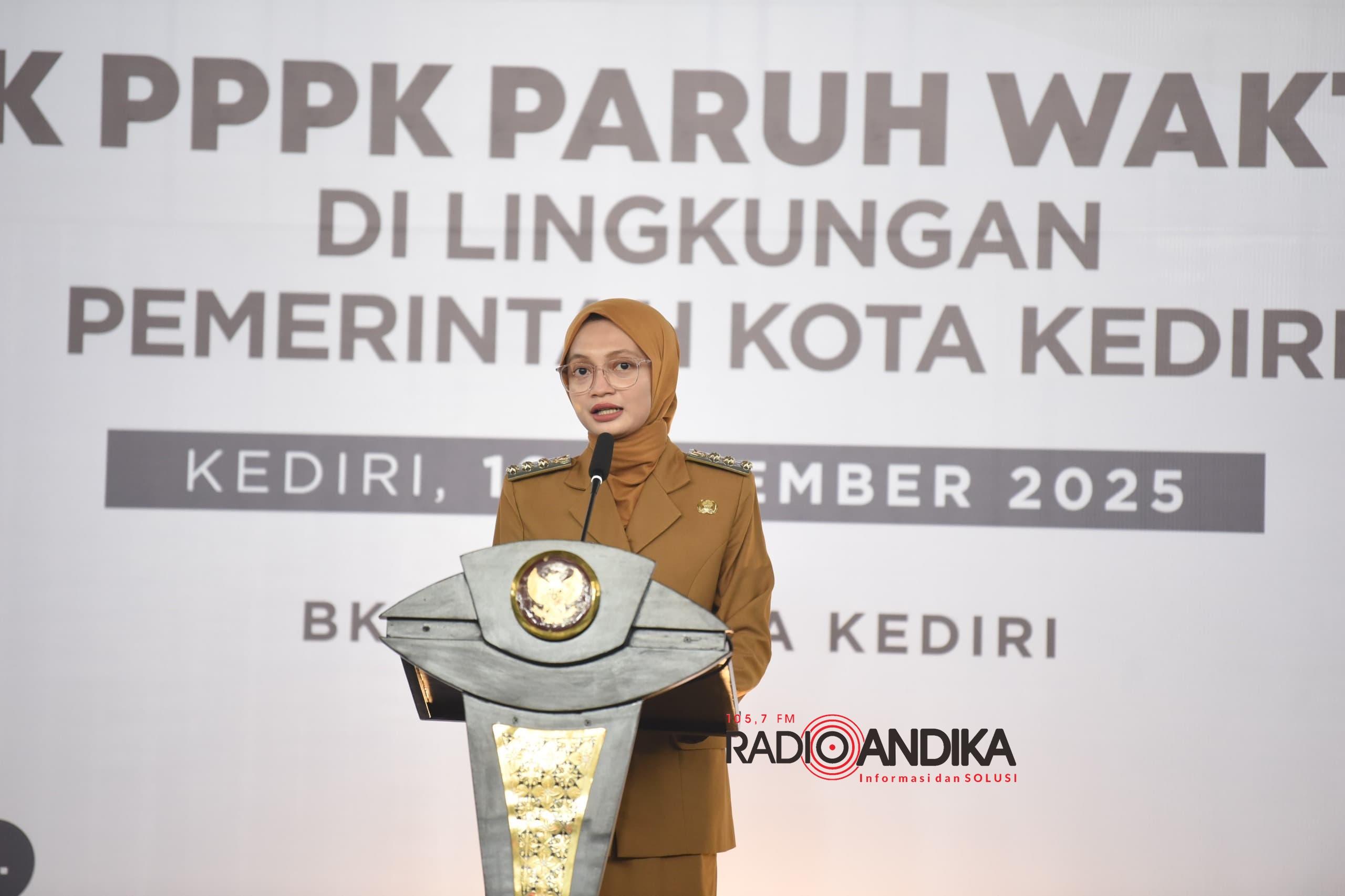 Dalam sambutannya, Wali Kota Kediri yang akrab disapa Mbak Wali menyampaikan ucapan selamat kepada para penerima SK PPPK Paruh Waktu. Ia menyebutkan bahwa sebanyak 2.595 orang menerima SK PPPK Paruh Waktu.